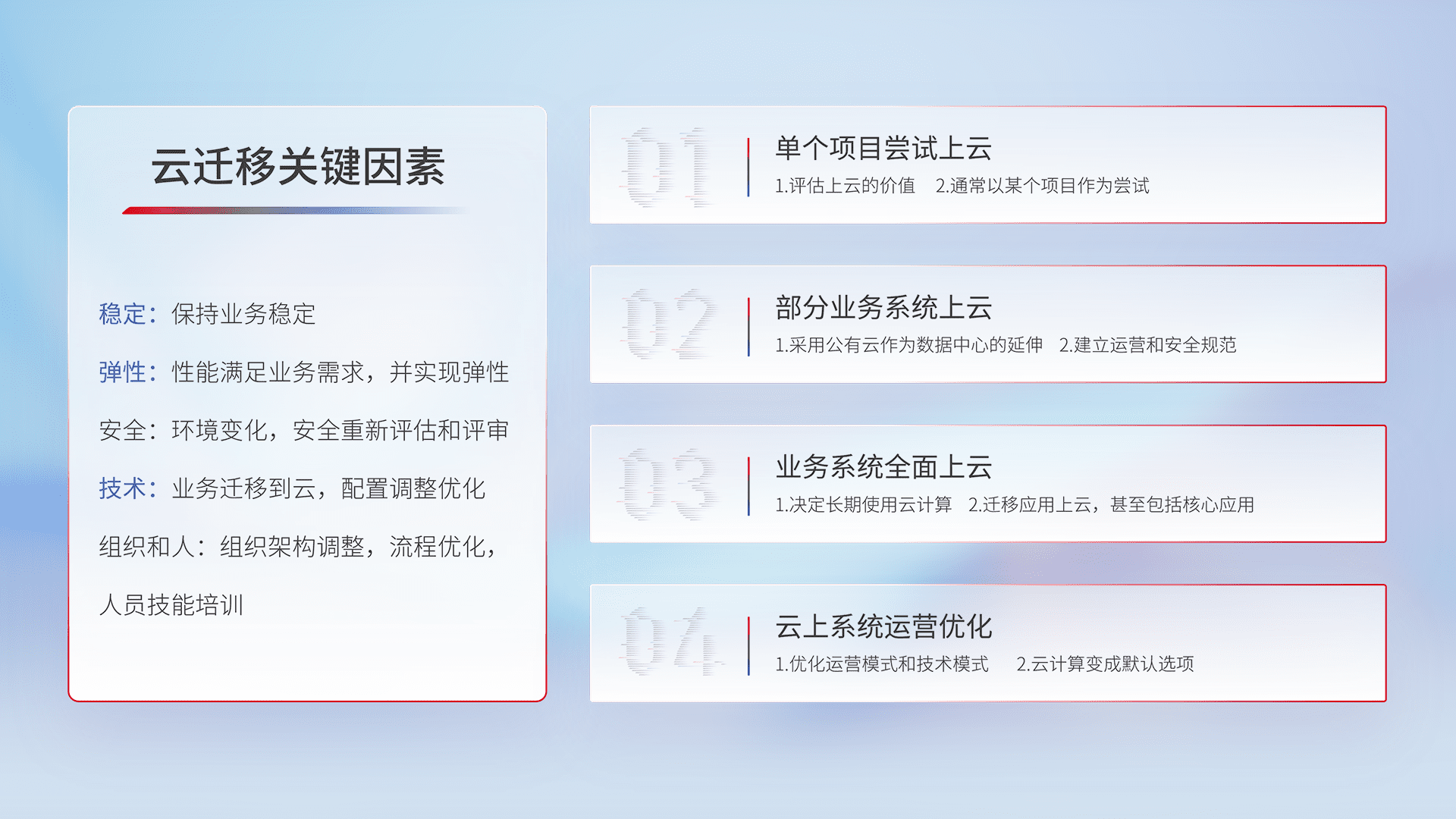 结合实际业务,,,从规划设计、、云平台选型、、、云原生改造、、、数据迁移、、、集成交付,,,,迁移全过程为客户识别最佳上云路径,,,,做好风险识别管理,,设计网络架构、、、身份权限、、、安全审计合规、、操作审计、、、日志审计、、、监控告警策略、、、、多站点容灾设计等,,,对云上基础设施进行整体规划,,,提升IT治理水平,,,,以满足弹性、、高可用、、、高性能的需求。。。