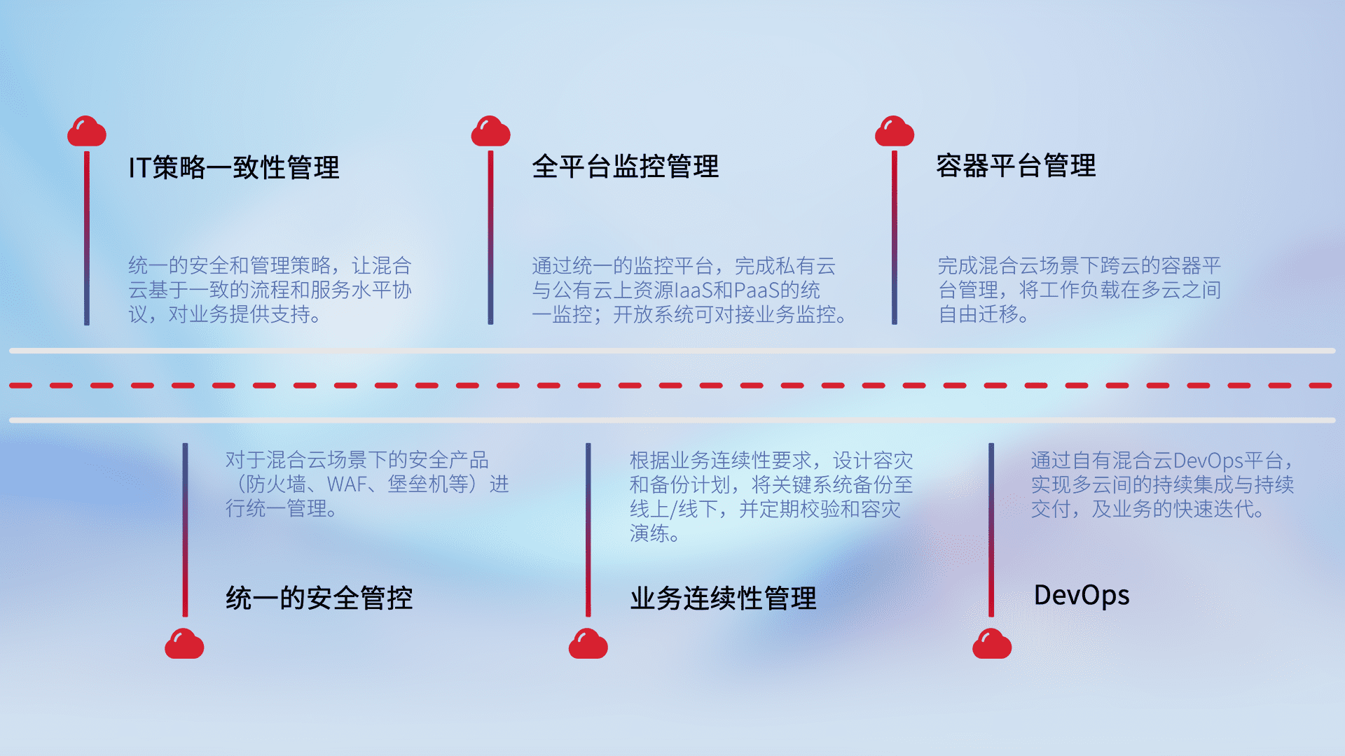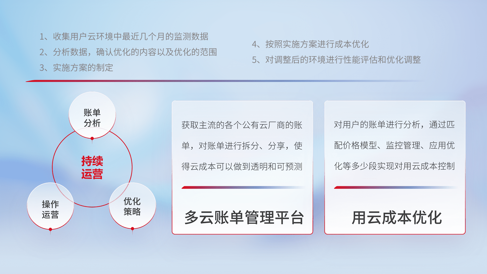 通过多云纳管,,以统一的资源数据模型把客户的云资源进行抽象和封装,,,,进而实现对多云资源的统一操作,,,,保障云资源管理的可靠性、、稳定性与可用性。。。。量身定制化运维内容,,,,配置、、、、开发运维、、补丁管理、、备份、、监控、、、认证和访问管理、、、、审计和日常巡检等,,,,保障在用云过程中的可靠度,,稳定度以及高可用率。。。。